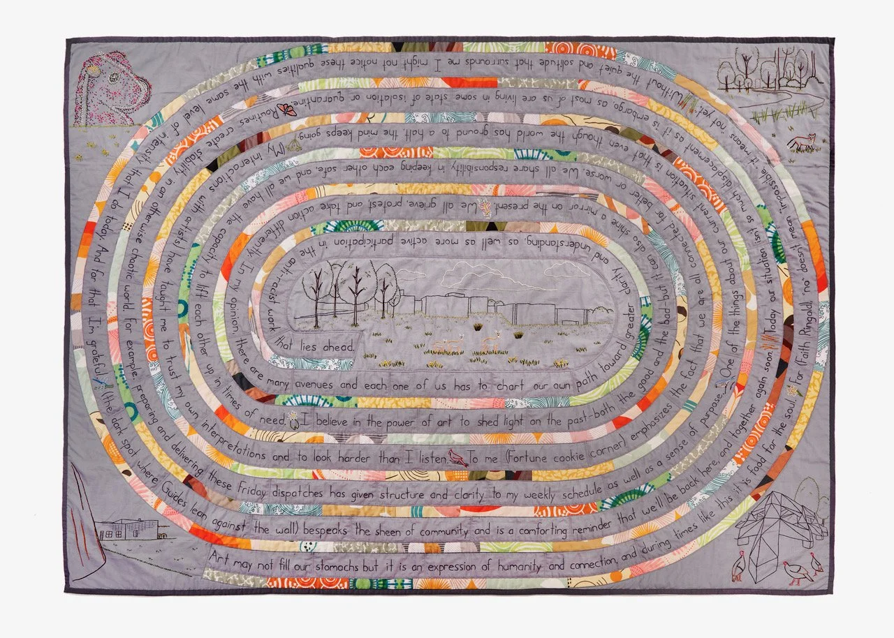 Custom quilt designed and constructed for Emily and Mitch Rales. Hand embroidered images depict art, architecture and nature found at Glenstone. The hand embroidered text is composed of quotes by Emily Rales.